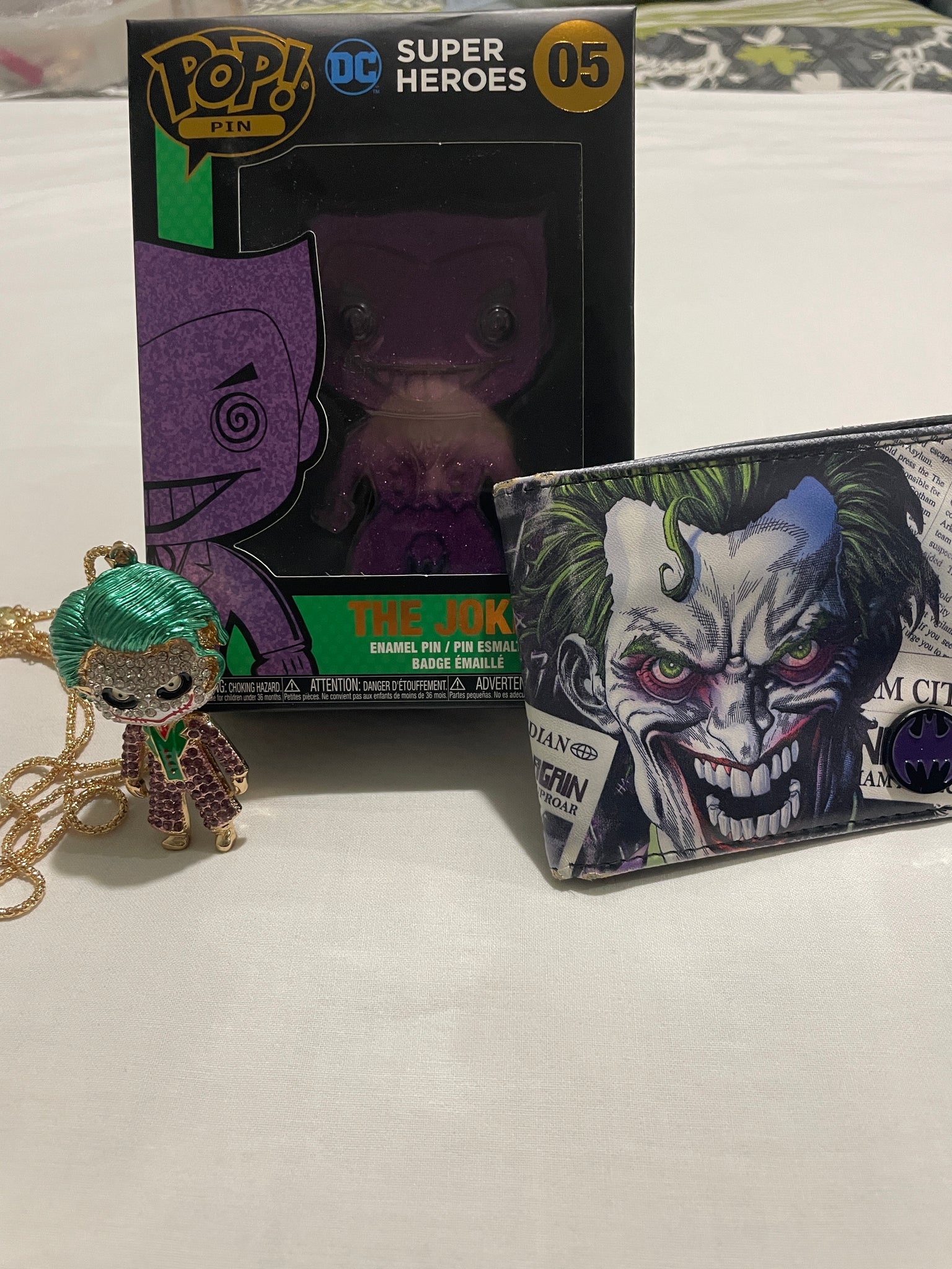 Dive into the world of Gotham with this exclusive Batman Joker Collection. Featuring vibrant, a multicolored enamel pin, a stylish wallet & Betsey Johnson necklace!