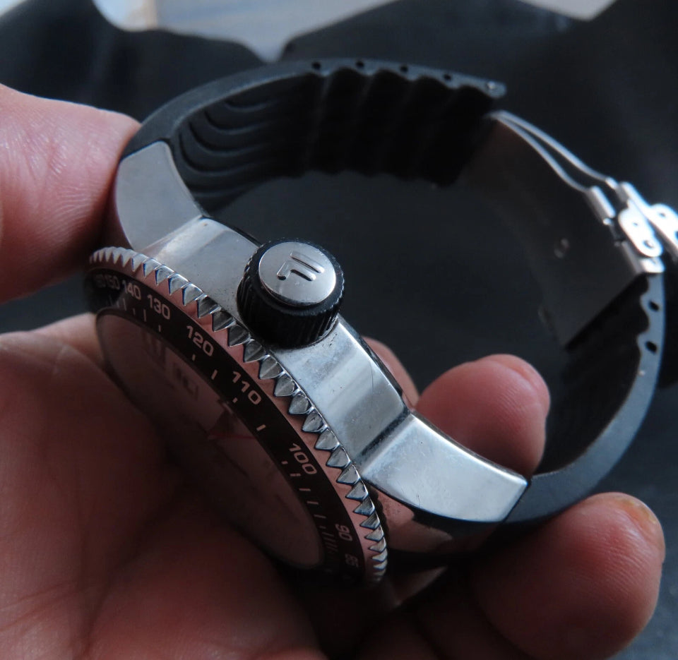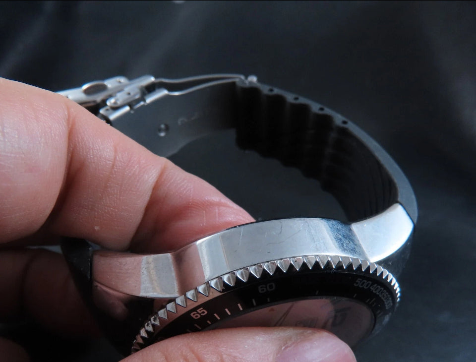 The watch is equipped with a practical date window, a quartz movement for precise timekeeping, and a comfortable rubber band that secures with a sleek black clasp!