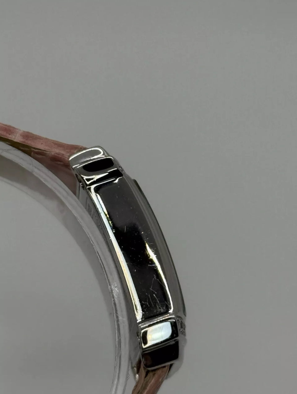 The pink two-piece leather strap provides comfortable wear and a classic touch to the overall design.